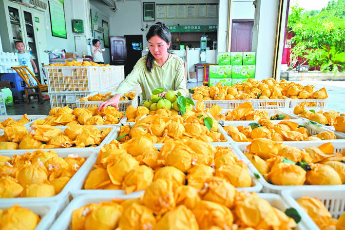 8月8日,宣恩县椒园镇黄坪村果农正在挑选黄金梨。(全媒体记者 陈绪开 摄)