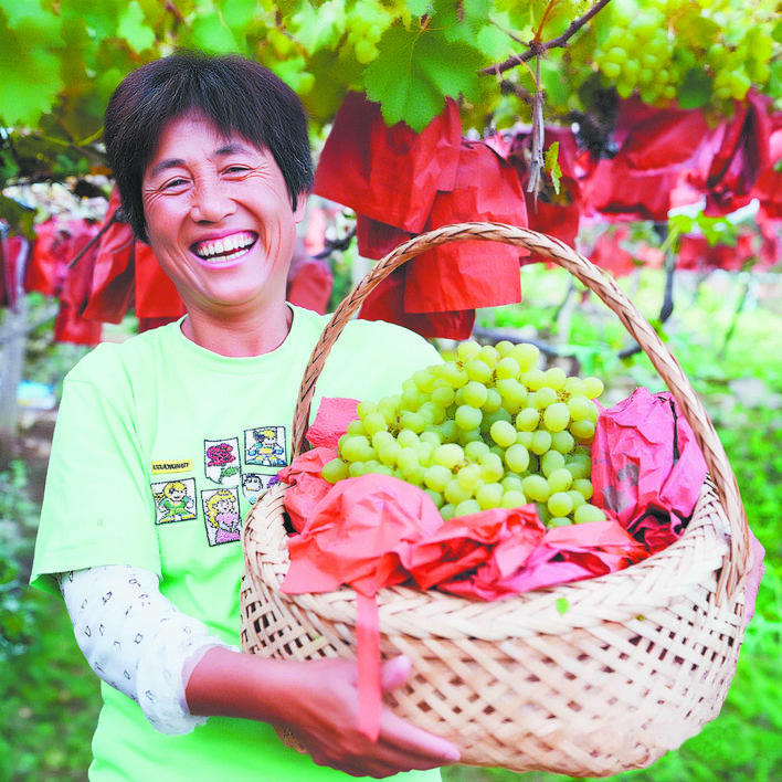 9月18日,建始县花坪镇关口村的葡萄园里,果农的笑容跟葡萄一样甜美。(全媒体记者 杨亚玲 摄)