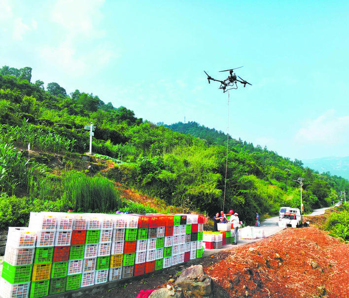 近日,巴东县的夏橙迎来丰收,果农正通过无人机吊运水果。(全媒体记者 焦国斌 摄)