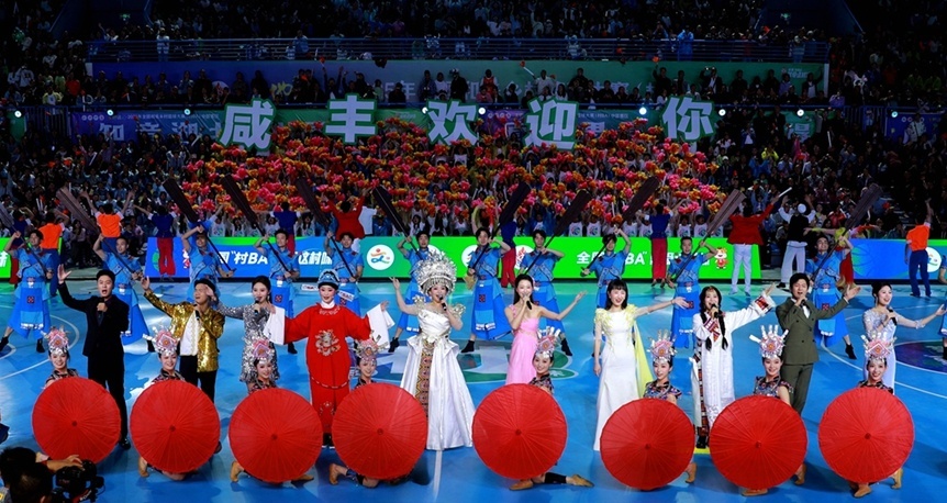 小村之夜,灯光璀璨。篮球场上,农民球员们奔跑拼搏;观众席上,各族群众欢呼喝彩;舞台上,十一省歌声交融回荡。这场赛事不仅展现了乡村体育的活力,更通过文化互嵌、经济互嵌、社会互嵌和心理互嵌,让“中华民族一家亲”的理念深入人心。